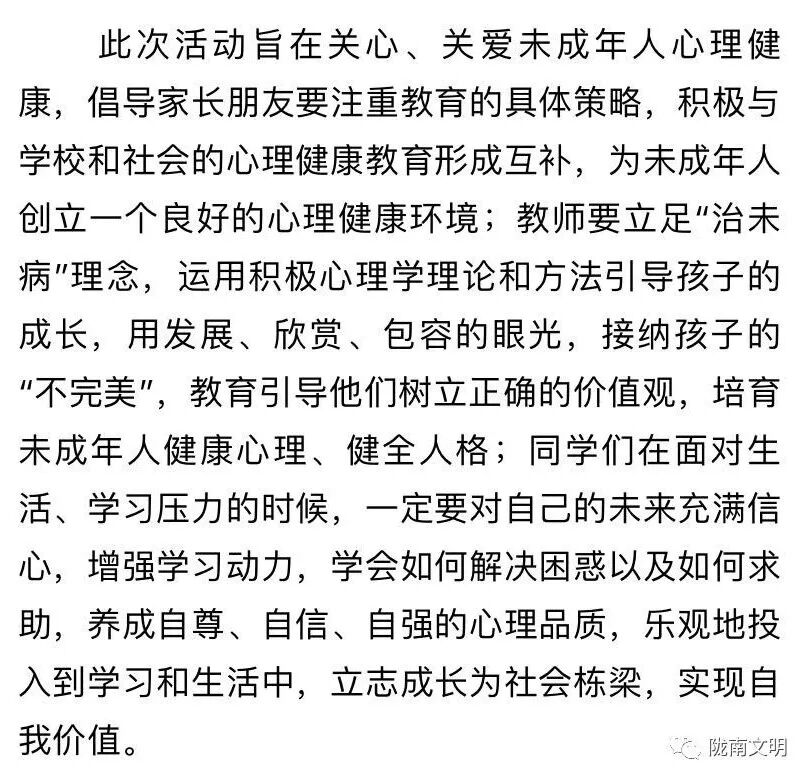 在“家长场”上,兰州八十六中教师、国家二级心理咨询师王晓燕作了“家长与孩子如何进行沟通”的专题讲座;“教师场”由中国心理卫生学会心理咨询专业委员会委员、副教授、副主任医师杨静进行了“培育未成年人健康心理、健全人格”的专题讲座;“学生场”上由国家二级心理咨询师、主治医师贺婧作了“青少年学生心理健康”的专题讲座,活动中各位专家与听众进行了互动答疑,并发放了问卷调查表。