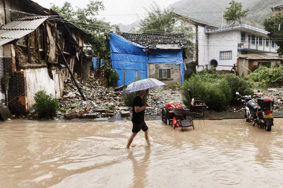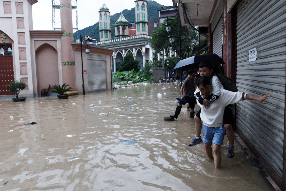 Pedestrians walk through water flooding a street in Wenxian county, Northwest China's Gansu province, on Aug 17, 2020. [Photo by Jiang Dong/chinadaily.com.cn]