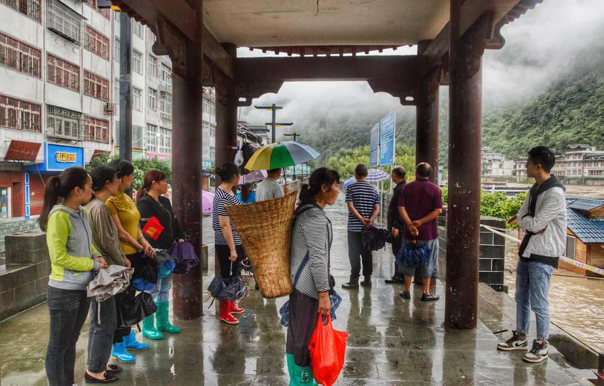 Pedestrians temporarily take shelter from the road under a pavilion while waiting for the rain to end in Wenxian county, Northwest China's Gansu province, on Aug 17, 2020. [Photo by Jiang Dong/chinadaily.com.cn]