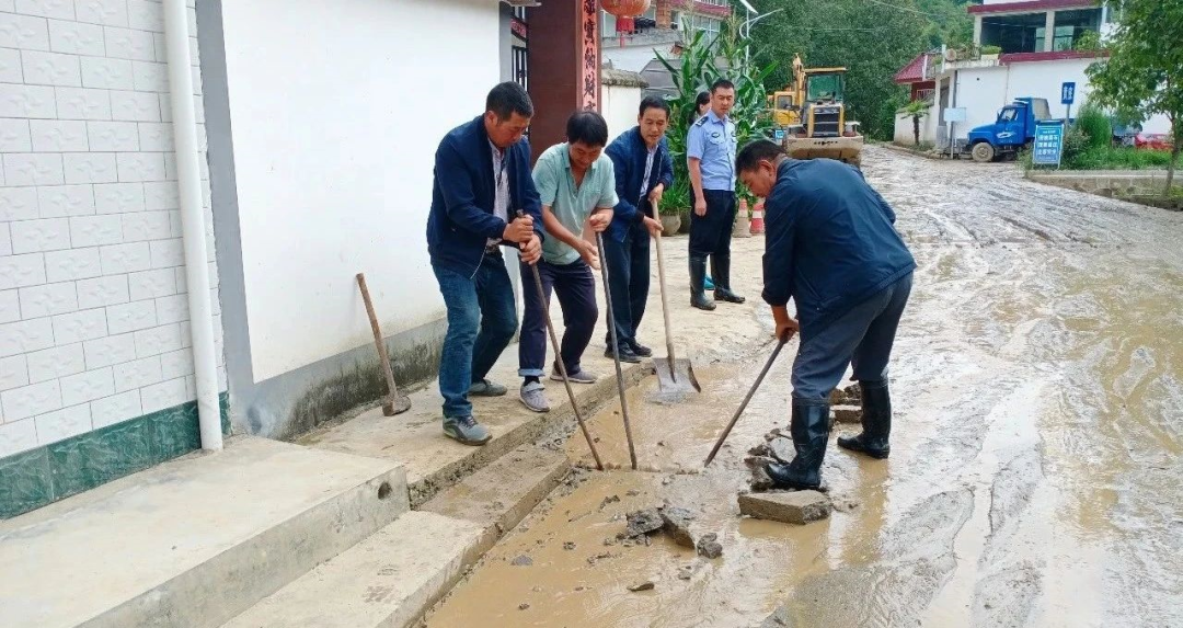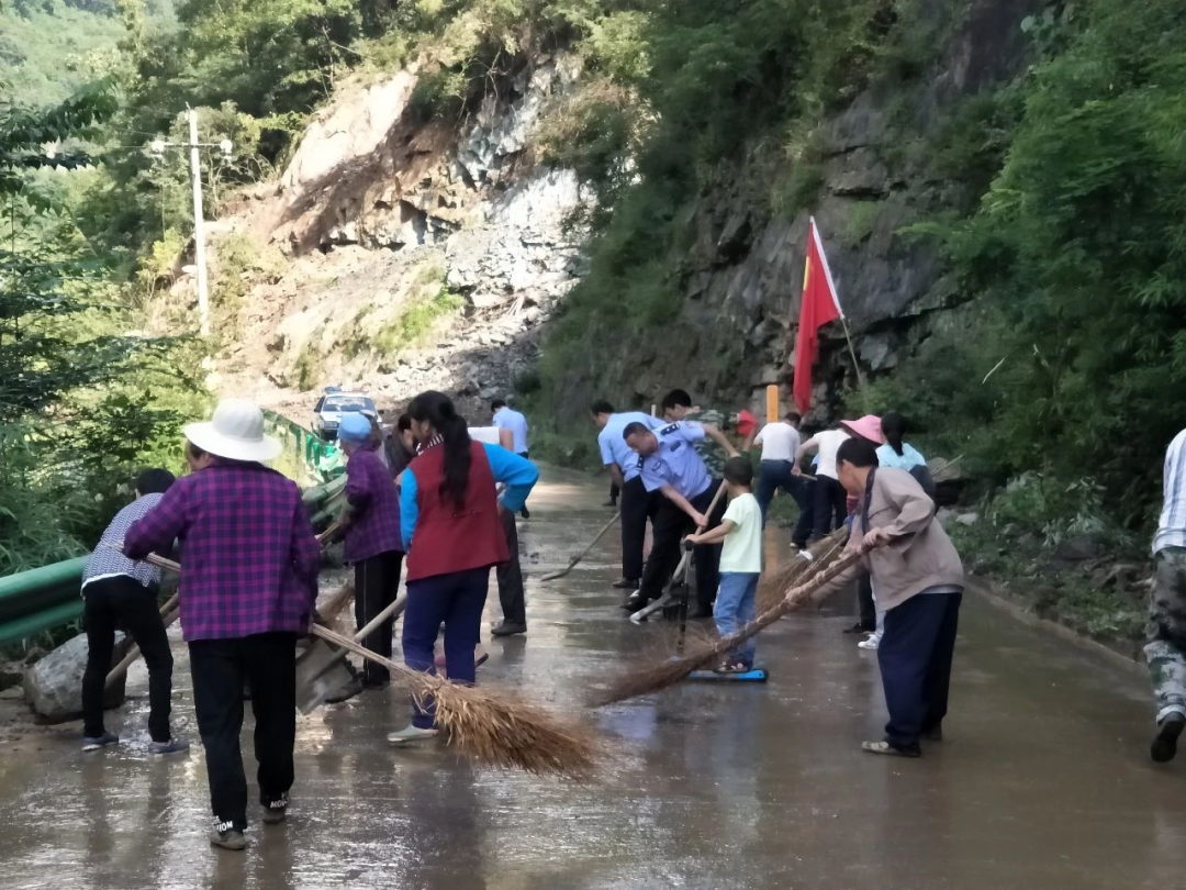 阳坝派出所民警帮助群众清理道路淤积、恢复道路通行秩序。