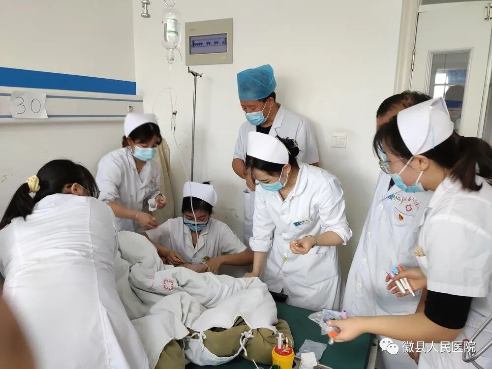 可杜大妈却因为溺水沉到了水下,河岸边的热心市民相互配合,有积极打捞杜大妈的,有现场急救小明的,有拨打120,110电话的……,杜大妈被救上河岸时已经昏迷不醒,口唇发青,徽县120快速到达了现场,专业的急救使杜大妈恢复了心跳,呼吸道的阻塞也已通畅,但杜大妈还是昏迷不醒!120快速将杜大妈转运到徽县人民医院外一科,伤情就是命令!外一科全体医护人员按照徽县创伤中心应急预案,全员紧急动员:杨浩副主任,张大禹及张晓轩快速对两个病人全面体格检查,开放气道,清除呕吐物,根据病情调整用药;穆一凡主治医师准备好了呼吸机,除颤仪,随时准备应对再次的呼吸心跳骤停;护士长魏琳带领护理小组建立心电监护,吸氧和液体通路,留置胃管和导尿,保障及时用药和病情检测,科主任张瑞峰全面协调把控抢救流程,快速决定抢救细节,及时上报院长刘炜明,院领导快速指示:“尽全院之力积极救治!”。徽县人民医院创伤中心全速运转起来:麻醉科李桥医生准备气管插管,内科康娟主治医师协助药物抢救,外二科杨雄主任监控中枢神经系统功能。