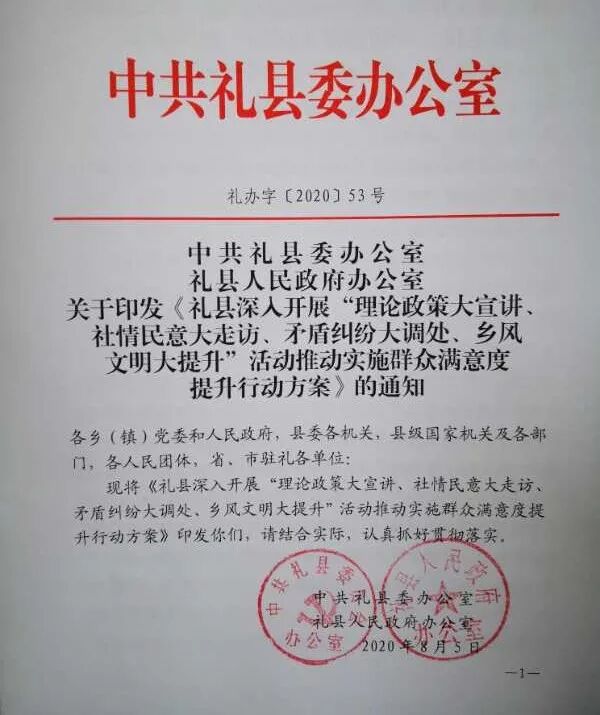 为进一步推进脱贫攻坚各项政策落实,为决战决胜脱贫攻坚打下良好基础。连日来,礼县按照《礼县深入开展“理论政策大宣讲、社情民意大走访、矛盾纠纷大调处、乡风文明大提升”活动推动实施群众满意度提升行动方案》要求,深入基层群众家中,倾听群众呼声,普及文明知识,多措并举积极开展“大宣传、大走访、大调处、大提升”活动,群众满意度明显提升,让文明新风在礼县大街小巷开花结果。