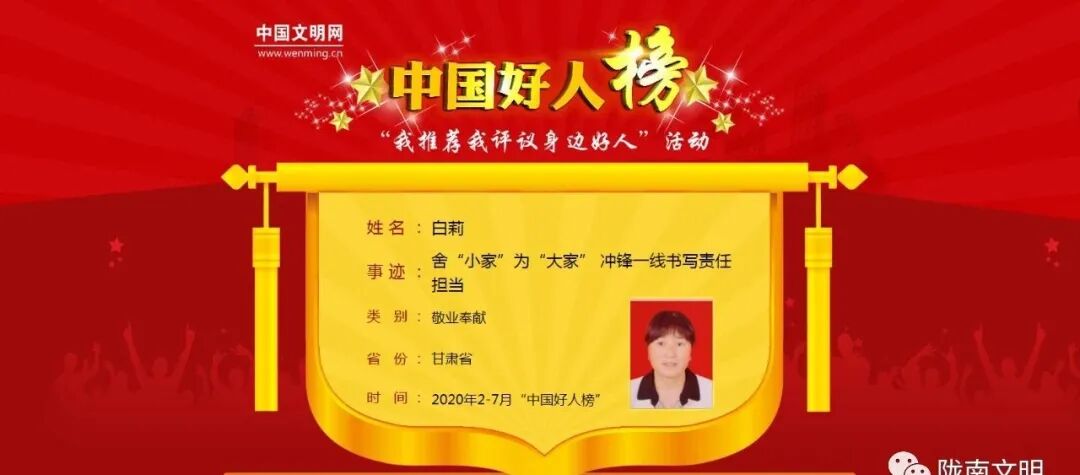 9月17日,中央文明办发布2020年2月至7月“中国好人榜”,中央宣传部副部长傅华出席网上发布仪式揭晓榜单。陇南市推荐的徽县水阳镇南山村乡村医生白莉入选“敬业奉献好人”。