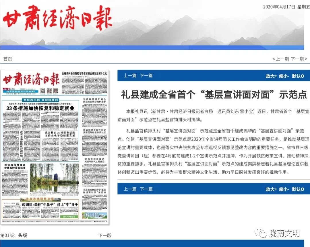 近日,甘肃省首个“基层宣讲面对面”示范点在礼县盐官镇排头村揭牌。
