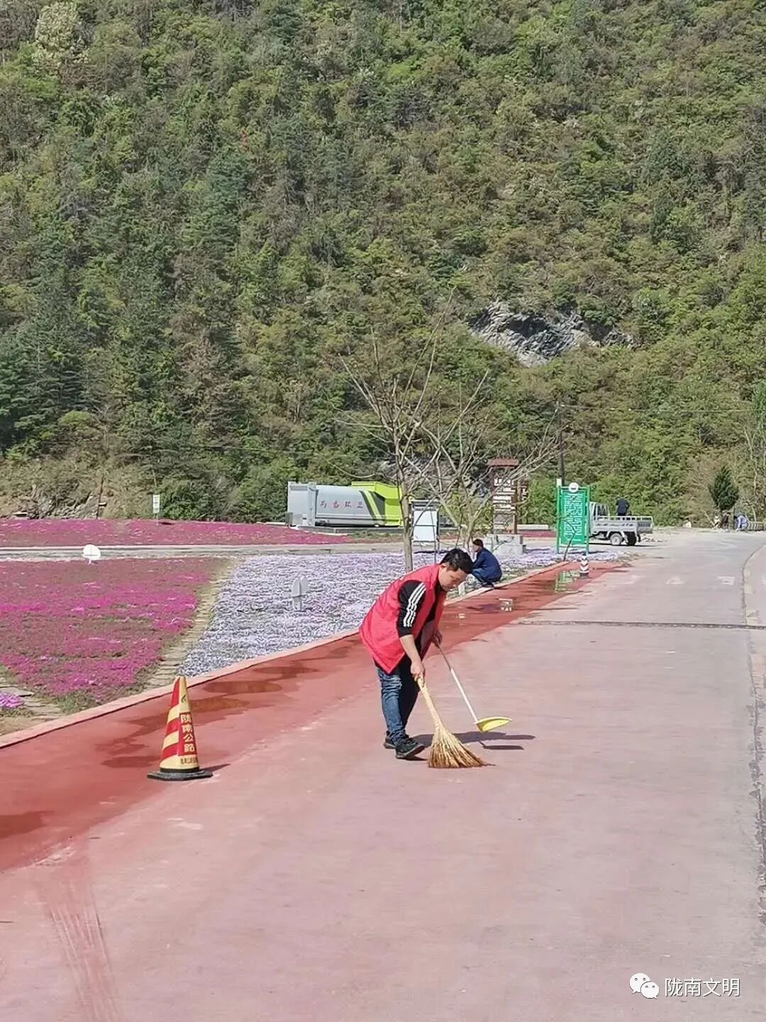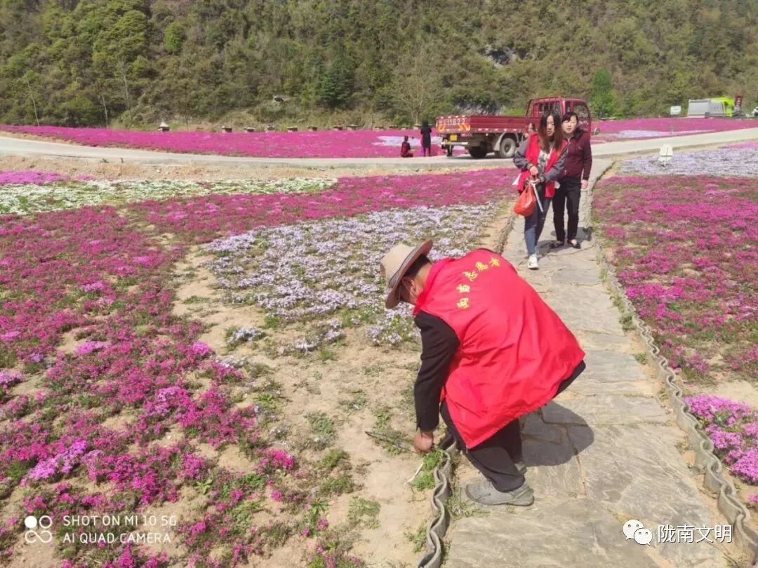花海里还有这样一群身影,“请把垃圾装好带走”“请不要践踏花儿”,他们是这次赏花活动的接待者、引路员、保洁员,是花海的守护者,他们就是站儿巷镇新时代文明实践志愿者。