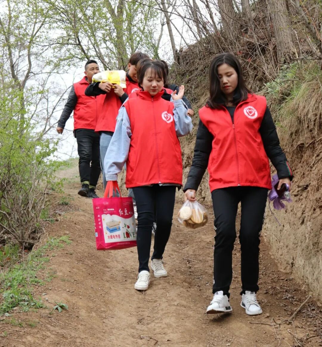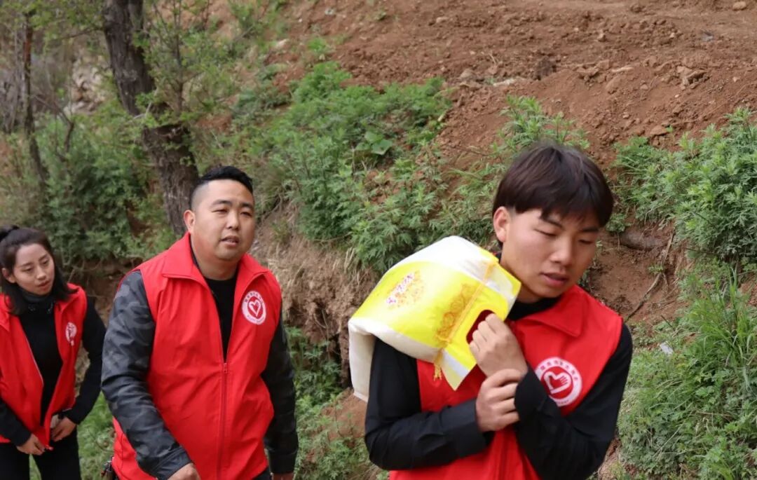 山路险峻,也阻挡不了志愿者们爱心的步伐。