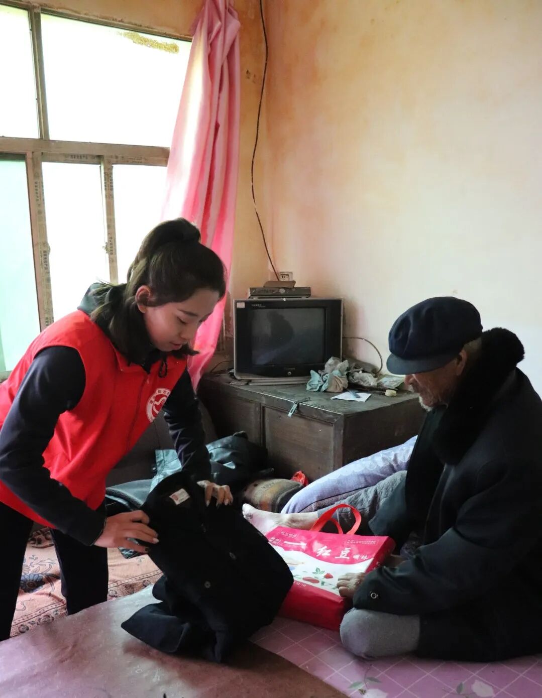 志愿者都帮助老人们打扫卫生。