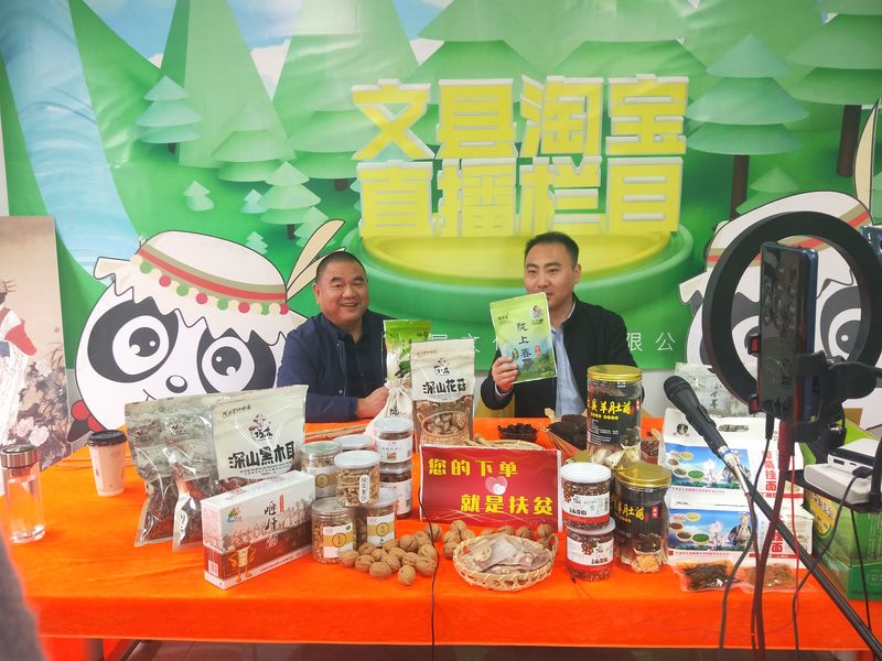 郭文平(左)利用网络直播平台展示文县茶叶。受访者供图