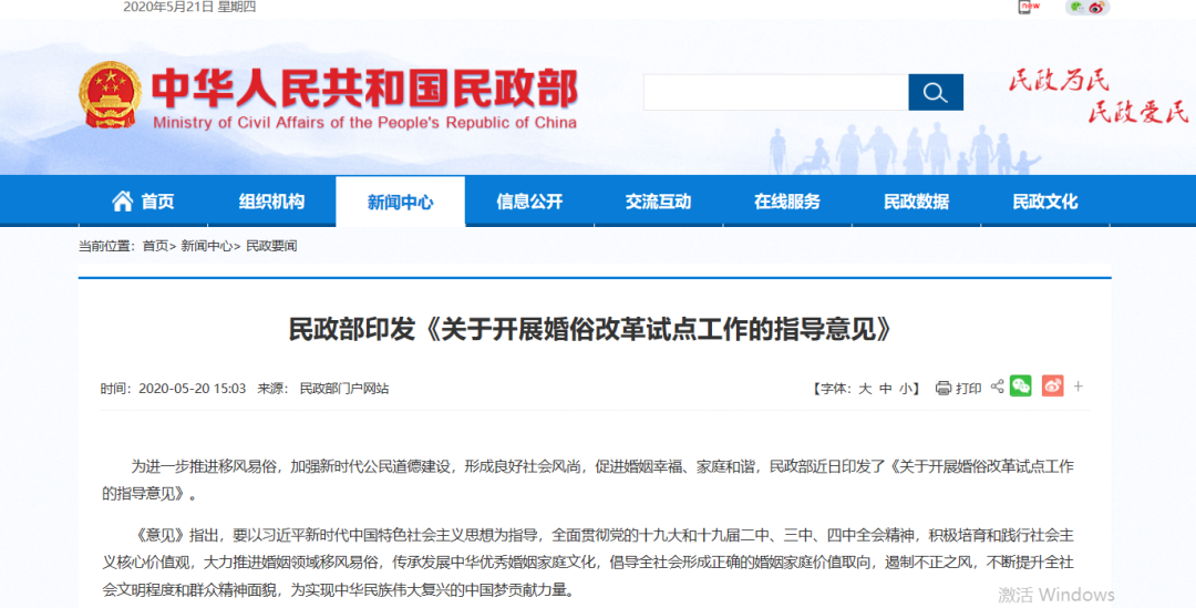 民政部网站5月20日消息,为进一步推进移风易俗,加强新时代公民道德建设,形成良好社会风尚,促进婚姻幸福、家庭和谐,民政部近日印发了《关于开展婚俗改革试点工作的指导意见》。